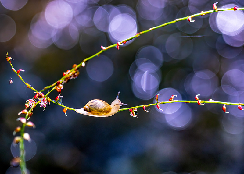 2席の「綱渡り」は、オカモノアラガイと2本の茎の曲線が、画像内にバランスよく配置されている。背景の玉ボケをセンス良く取り込み、ほどよく入った赤い色彩も効果的だ。「羅網鹿」は、エゾシカの災難を記録したメッセージ性のある作品だ。このエゾシカは、春に角が脱落するときロープから解放されるが、人間がつくったものが野生生物に危害を与える事例が後を絶たず、私たちはそれを忘れてはならない。