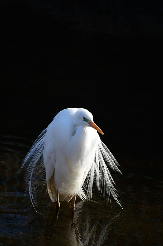 鮫島和子賞の「静寂の貴婦人」は、背景を暗くし、ダイサギの白を際立たせた。広がった飾り羽が被写体の美を強調している。