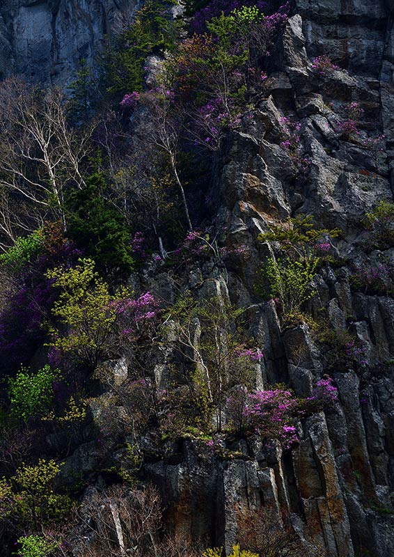 2席の「春の岩稜」は、斜光線が岩盤の凹凸を浮き上がらせるなか、切り立つ柱状節理に自生するエゾムラサキツツジの開花を捉えた作品だ。芽吹き前のダケカンバや新緑の木立なども、厳しい環境を住処にする植物のたくましい生命を描き出している。
